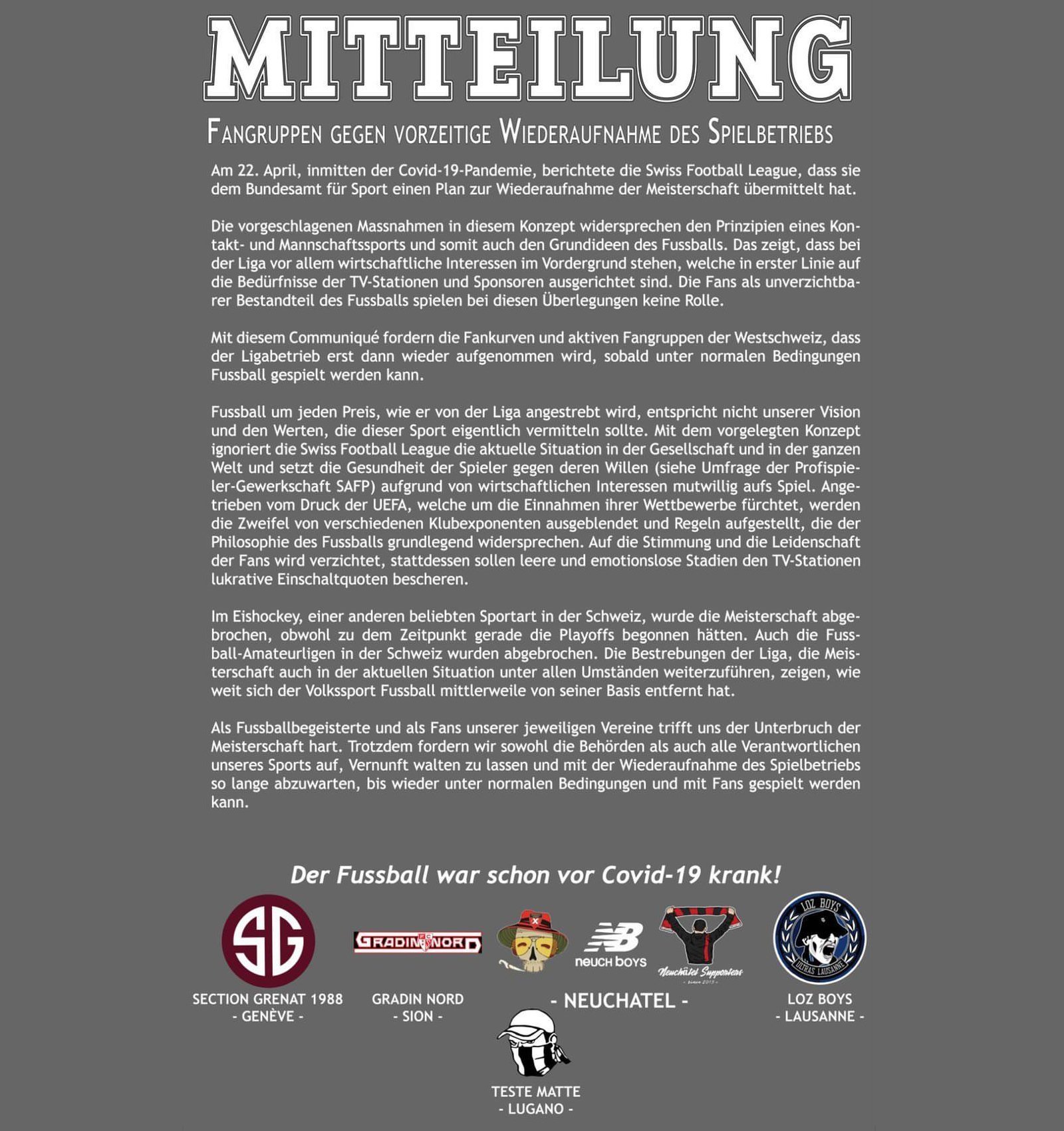Als Reaktion auf die momentane Situation schlossen sich mehrere Fangruppierungen zusammen, um ein gemeinsames Communiqué zu veröffentlichen.