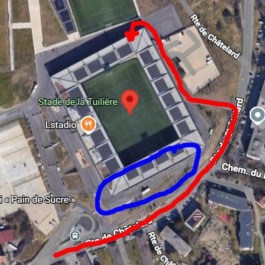 Auch am Sonntag zog ein grösserer "Mob" aus Genf in Richtung Stade de la Tuilière. Der Fanmarsch soll "geordnet" von Statten gegangen sein. Kurz vor dem Stadion spitzte sich die Situation jedoch zu. Dies, weil der Fanmarsch stoppte. Während an der Spitze des Zuges die Ultras ihre Schlachtrufe anstimmten, versuchte die Polizei von hinten den Tross wieder in Bewegung zu bringen. Unter Einsatz von Schlden rückten die Einsatzkräfte vor. Wie die Tribune de Genève bereits am Sonntag berichtete, waren jedoch keine Unruhestifter, sondern besonnene Fans am Ende der Gruppe die Leidtragenden. Sie kassierrten Schubser und Schläge, bis sich die ganze Gruppe wieder nach vorne bewegte. Weit kam der Mob jedoch nicht. Direkt hinter der Heimkurve bauschte sich die Situation weiter auf. Von beiden Seiten flogen Gegenstände. Lausannes Ultras hatten dabei den Vorteil, dass sie auf einer Erhöhung gleich hinter der Tribüne standen. Genau dieses Szenario hat man in der Vergangenheit schon mehrmals erlebt. In quasi jedem Léman-Derby stellt dieser Ort ein Nadelör dar. Es soll keine Entschuldigung sein, dass sich gewisse Personen nicht im Griff haben, aber gibt es wirklich keine Möglichkeit, um dieser Situation aus dem Weg zu gehen? Getreu dem Motto: "Viele Wege führen nach Rom", müssten doch auch mehrere Wege in den Gästesektor des Stade de la Tuilière führen? Alternativ müsste man sich in Lausanne Gedanken machen, ob man temporäre, bauliche Massnahmen treffen könnte, oder den Bereich kurzzeitig zu räumen, bis der gegnerische Fanmarsch vorbeigezogen ist. An dieser Stelle sei nochmals erwähnt, dass das Verhalten einzelner Chaoten nicht gutzuheissen ist. Man muss sich aber die Realität vor Augen halten, dass ein reibungsloses Vorbeiziehen, ohne andere Massnahmen an dieser Stelle, nicht funktioniert. Untenstehend eine vereinfachte Visualisierung, wo der Fanmarsch auf der Route de Châtelard entlang geht. Blau eingekreist ist die Heimkurve des FC Lausanne-Sport.